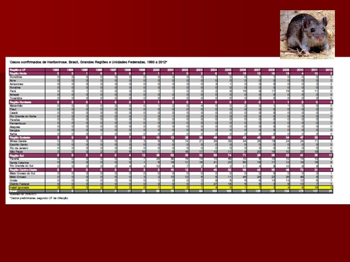Casos no Brasil – 2007 -2012* - Casos confirmados: 716 (letalidade 37, 2%) - Casos em 14 estados do país; - CO: 32, 4%; Sud 25, 2%; Sul 24, 1% - RS: 45 casos; - SC: 91 casos; - PR: 54 casos - Rural e ocupacional: > 90% - Sexo masculino: 74, 9%