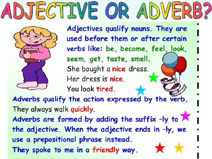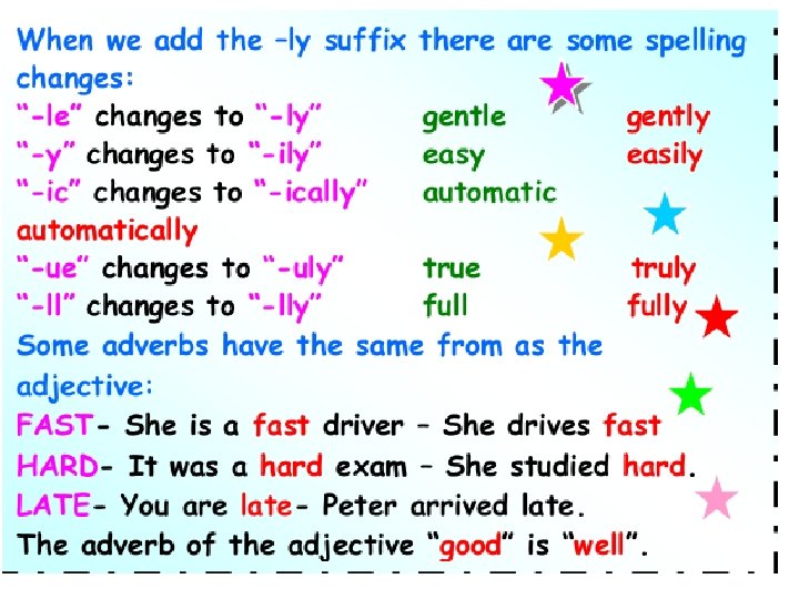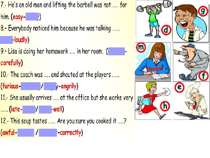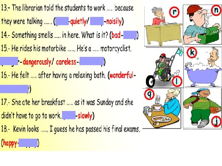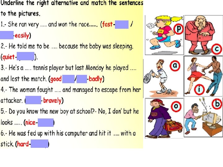 careful student. She does her homework …………. carefully 1. Marilyn is a …………………. (careful/carefully) silently silent indeed. It works very ………… 2. Our new washing machine is very ……………. . (silent/silently) rudely rude 3. Alice is really a ……………. . girl. She always behaves ……………… (rude/rudely) cleverly(clever/cleverly) 4. Mike is a …………………. student. He answers all the questions ……………. regular 5. This man buys clothes from this shop regularly …………………. He is our ………………costumer. (regular/regularly) quick 6. Brian really walks quickly ……………. . He is a ………………walker. (quick/quickly) slowly 7. Sally opened the door of the bedroom ………………. . and she saw the thief. (slow/slowly) close 8. Steve is my ………………. friend. We always go out together. (close/closely)