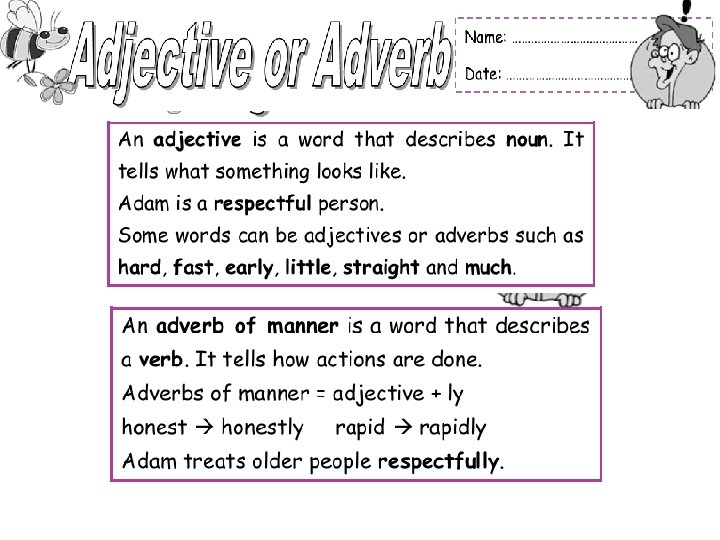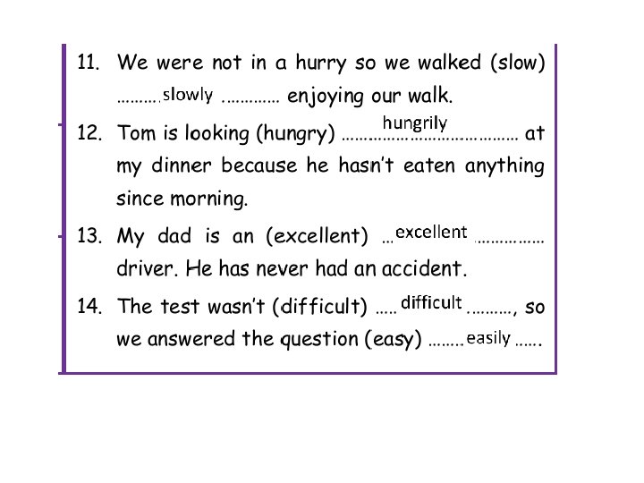 kind 9. Michael never breaks his friends’ hearts. He is really a ………………person. (kind/kindly) kindly 10. Rachel behaved really ………………. towards all the students in the class, sos he made a lot of friends. (kind/kindly) badly 11. That teacher treats her students ………………. . Nobody likes her. (bad/badly) anxiously 12. My father looked out of the window …………………. as he heard a strange sound. (anxious/anxiously) patiently for two hours in the cafe. 13. He waited his friend ………… (patient/patiently) 14. He is a good ……………. . painter. He painted our house well ……………. . (good/well) sympathetically 15. My mother listened to my problems ……………. last night. (sympathetic/sympathetically) wild 16. A crocodile lives near rivers and it is really a ………………. . animal. (wild/wildly)