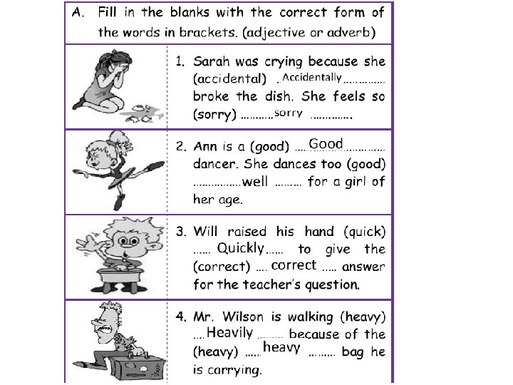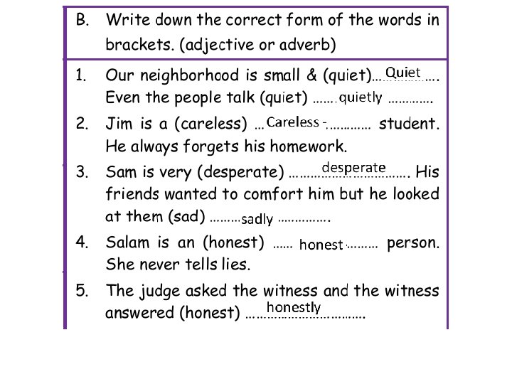 beautifully 17. Joseph sang …………at the party last Sunday. Everybody was fascinated. (beautiful/beautifully) beautiful 18. Sindy is the most ……………. . girl I have seen in my whole life. (beautiful/beautifully) excitedly 19. Frank came into the class …………. and said there was a snake in the hall. (excited/excitedly) noisily 20. The children run in the school hall ……………. (noisy/noisily) recent 21. I have got …………………. news about the town. (recent/recently) 22. What have you been doing …………………. recently ? I haven’t seen you for ages. (recent/recently) clearly 23. I understood the lesson very ………………. . today. (clear/clearly) easy 24. These questions are very ………………. . I can answer them all in ten minutes. (easy/easily) correct 25. All my answers in the last Maths exam were ………………. . This means I correctly (correct/correctly) answered all the questions …………