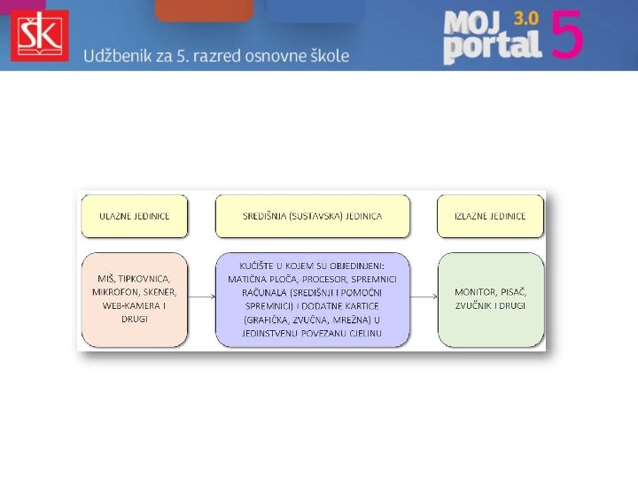 Središnja (sustavska) jedinica � služi za obradu podataka � u njenom kućištu nalaze se dijelovi (komponente) računala ◦ ◦ ◦ matična ploča procesor središnji i pomoćni spremnici dodatne kartice (grafička, zvučna, mrežna …) strujno napajanje