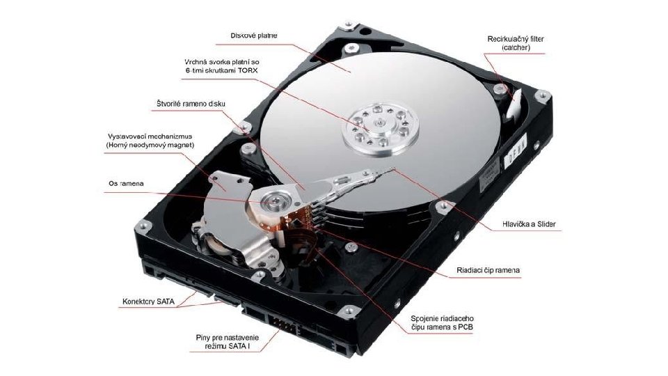 Hard disk • alebo pevný disk, HDD, je zariadenie, ktoré sa používa na uchovávanie dát • dáta sa na pevný disk zapisujú pomocou magnetického záznamu → má veľkú výhodu najmä v tom, že sú uložené natrvalo, teda až pokiaľ nie sú zmazané používateľom alebo prístrojom • je to energeticky nezávislé pamäťové médium
