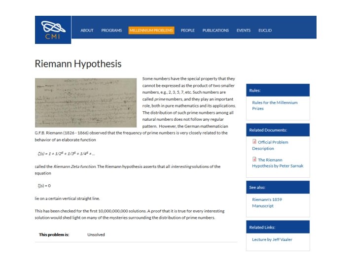 Riemann Hypothesis Do all the solutions of a certain equation have a particular form? Do all the non-trivial zeros of the Riemann Zeta function have real part 1/2? http: //www. claymath. org/millennium-problems/riemannhypothesis