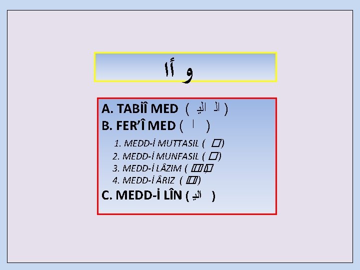 harfi sakin nceki harf mefth harfi sakin nceki Slides: 10 Download presentation ( )ﻱ harfi sakin ﺣﺮﻑ ﺍﻟﻠﻴﻦ Önceki harf meftûh ( )ﻱ harfi sakin ﺣﺮﻑ ﺍﻟﻠﻴﻦ Önceki harf meftûh Sükûn-u lâzım VECİHLER 1 -Tûl (3 -4) 2 -Tevessut. (2 -3) Harf-i lîn ﺍﻟﻳ Not: Sükûn-u Lâzım için iki örnek vardır. Sükûn-u lâzım VECİHLER 1 -Tûl (3 -4) 2 -Tevessut. (2 -3) Harf-i lîn ﺍﻟﻳ Not: Sükûn-u Lâzım için iki örnek vardır. Sükûn-u rız VECİHLER 1 -Tûl (3) 2 -Tevessut. (2) 3 -Kasr (1) ﺍﻟﻳ Harf-i lîn Not: Medd-i rız gibidir. Fakat lin harfi med olmadığından bir elif aşağı düşülür. Sükûn-u rız VECİHLER 1 -Tûl (3) 2 -Tevessut. (2) 3 -Kasr (1) ﺍﻟﻳ Harf-i lîn Not: Medd-i rız gibidir. Harf-i Med olmadığından bir elif aşağı düşülür. er tasarım