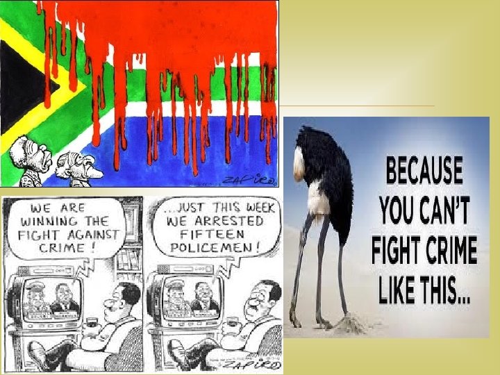 Crime and violence… …are violations of our Constitution and the Bill of Rights which state clearly that everyone has the right to feel safe and live in a safe environment. Is this right fully being carried out in our country? Think about some areas in the city – if our right to safety is so important why would you not walk around by yourself or drive through some parts? Who has to ensure our safety ?