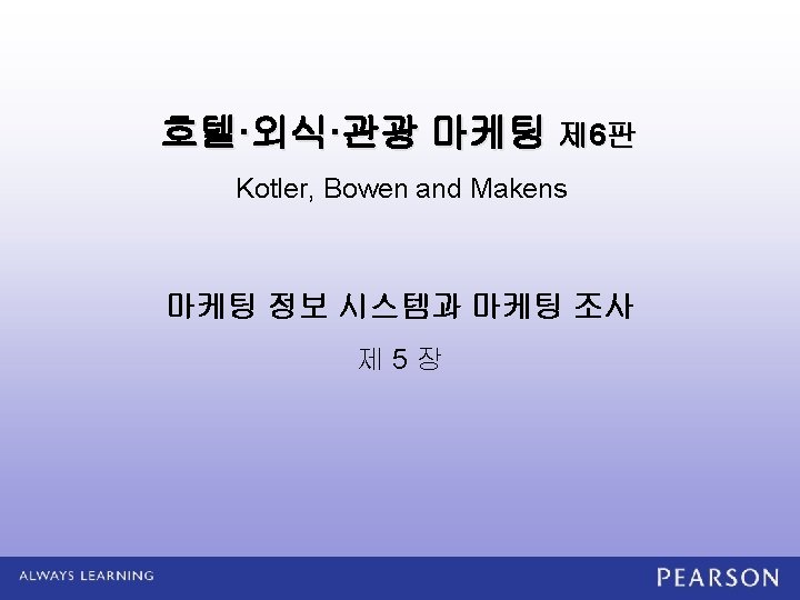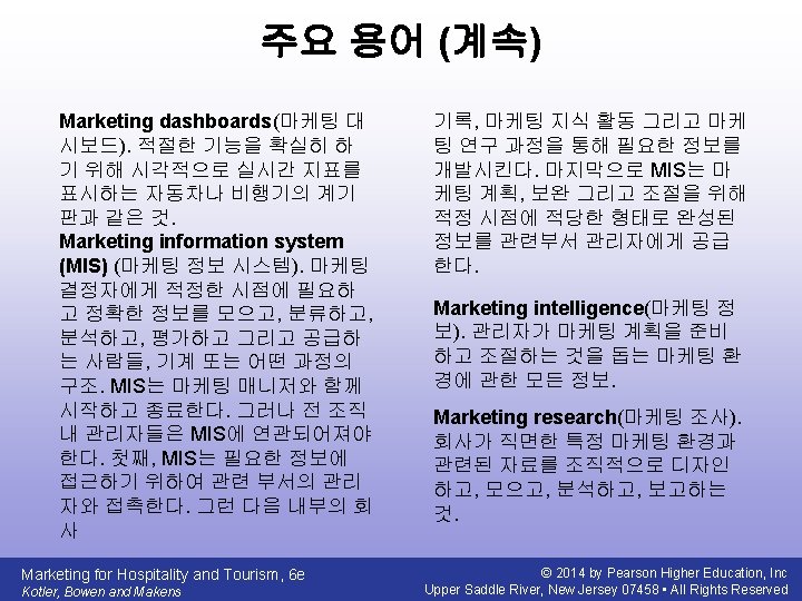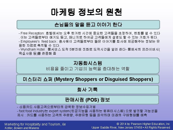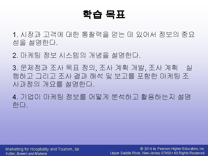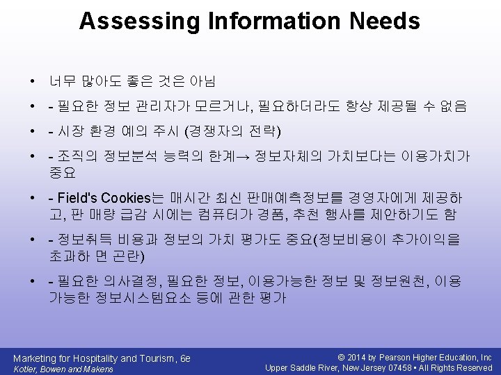 마케팅 정보 시스템 정보에 대한 욕구를 평가한다 마케팅 정보를 수집한다 Marketing for Hospitality and Tourism, 6 e Kotler, Bowen and Makens 마케팅 정보를 개발한다 © 2014 by Pearson Higher Education, Inc Upper Saddle River, New Jersey 07458 • All Rights Reserved