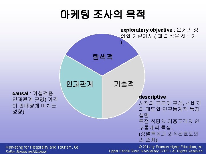 마케팅 조사 (문제를 ) 확인 하고 정의내린다 Marketing for Hospitality and Tourism, 6 e Kotler, Bowen and Makens (활동과 성과를 ) 관찰하고 평가한다 (대중과) 연결-소통한다 © 2014 by Pearson Higher Education, Inc Upper Saddle River, New Jersey 07458 • All Rights Reserved