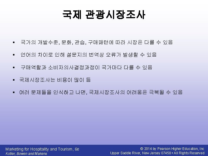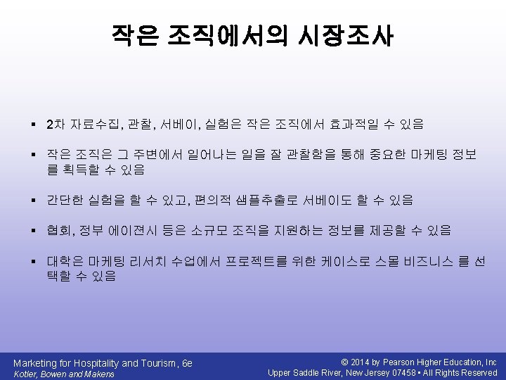 집행과 보고서 작성 ○ Implementing the Research Plan § § § 비용이 많이 듬 조사원 교육 중요 standard copmuter program 이용 : SPSS PC, SAS 등 ○ Interpreting and Reporting the Findings § 현란한 통계적 설명 지양 § 과다한 결과 수치 지양 → 필요하고 중요한 결과만 제시 Marketing for Hospitality and Tourism, 6 e Kotler, Bowen and Makens © 2014 by Pearson Higher Education, Inc Upper Saddle River, New Jersey 07458 • All Rights Reserved