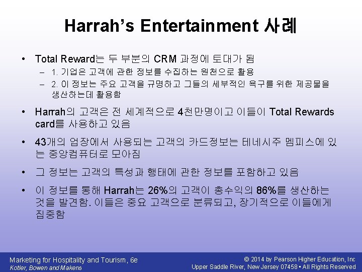 Harrah’s Entertainment 사례 • 미션 : ‘세계에서 가장 큰 사업체’ • Caesars Entertainment를 인수-합병하면서 43개 사업체에서 연간 71 억불의 수익을 벌어들이고 있음 • Harrah의 portfolio는 Harrah's, Caesars, Horseshoe, Bally's, Flamingo, Showboat, and The World Series of Poker 등을 포함한다. • Harrah의 성공이유 : 고객관계관리(CRM) and customer-loyalty 관리 • Harrah의 CRM strategy : pioneering card-based Total Rewards program • Total Reward 멤버는 Harrah의 시설에서 소비한 돈의 양에 기초해서 포인트를 받음 • 포인트는 Harrah의 모든 시설을 이용하는 현금과 동일하게 사용할 수 있음 Marketing for Hospitality and Tourism, 6 e Kotler, Bowen and Makens © 2014 by Pearson Higher Education, Inc Upper Saddle River, New Jersey 07458 • All Rights Reserved