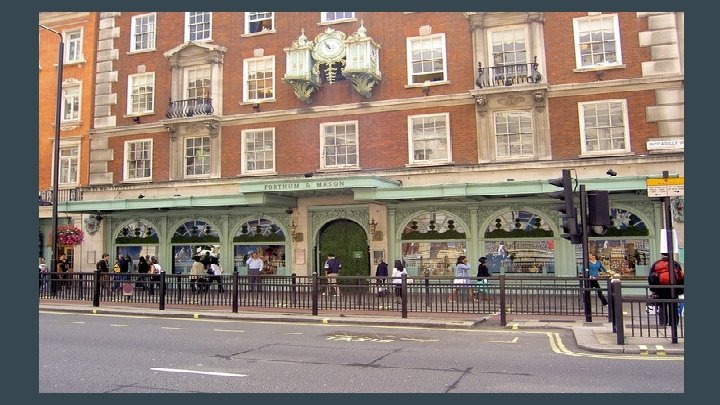 HISTORY It was established in 1707 by William Fortnum and Hugh Mason. Today it’s owned by Wittington Investments. At first, it started as a grocery store. After some time it changed into a department store. They helped the army march by feeding them dried fruit and honey. They supplied goods to the Earl of Egremont to entertain the Czar of Russia, who was in Britain to discuss the future of Europe at what was thought to be end of Napoleonic Wars. In 1851, at London’s Great Exhibition, Fortnum’s won a prize as importers of dried food and dessert goods. 1 st March 2012 was a historic day, Queen Elizabeth II visited the store to open the Diamond Jubilee Tea Salon. Założyli go William Fortnum i Hugh Mason w 1707. Dzisiaj właścicielem jest Wittington Investments. Na początku był to sklep spożywczy. Po jakimś czasie zamienił się w dom towarowy. Sklep pomógł armii dając im do jedzenia suszone owoce i miód. Dostarczyli towary Earlowi Egremont, aby mógł zabawić Cara Rosji, który był w Brytanii by omówić przyszłość Europy, w czasie uznawanym za koniec Wojen Napoleońskich. W 1851, podczas Wielkiej Wystawy Londyńskiej, Fortnum wygrało nagrodę “importerów suszonych owoców i wyrobów deserowych”. 1 Marca w 2012 był historycznym dniem, królowa Elżbieta II odwiedził sklep by otworzyć Herbaciarnię Diamentowego Jubileuszu