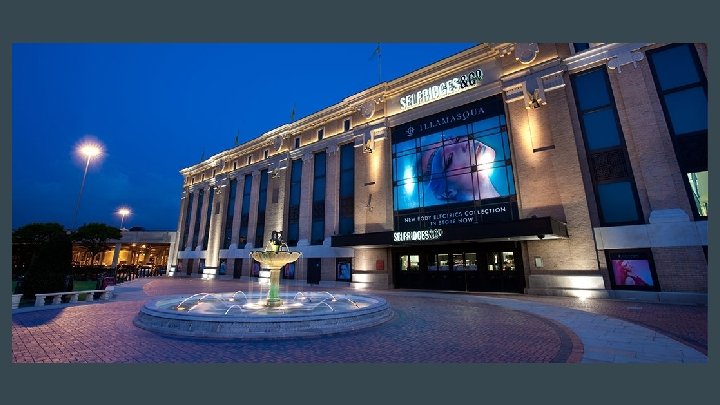 SELFRIDGES It’s a chain of high-end department stores in the UK, operated by Selfridges Retail Limited. It was founded by Harry Gordon in 1908. The shop on Oxford Street is the second biggest shop (after Harrod’s). It was opened on 15 th March 1909. You can also find other Selfridges in the Trafford Centre, Exchange Square in Manchester or in Bullring in Birmingham. Jest to sieć luksusowych domów towarowych w Wielkiej Brytanii, prowadzonych przez Selfridges Retail Limited. Założył go Harry Gordon w 1908. Sklep na Oxford Street jest drugim największym sklepem (zaraz po Harrodsie). Otworzono go 15 Marca 1909. Można również znaleźć kilka innych sklepów Selfridges w Trafford Centre, Exchange Square w Manchester czy w Bullring w Birmingham.