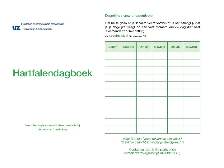 Alarmtekenen decompensatie Mogelijke symptomen 2 kg (of meer) gewichtstoename in 2 -3 dagen tijd Hoesten (vochtophoping in de longen en/of bijwerking van ACE-remmers) Opgezette enkels of benen Vermindering van het inspanningsvermogen, toename van vermoeidheid Strakker zitten van kleren of een vol gevoel in de buik Hartkloppingen