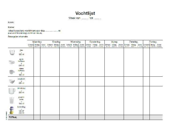 Vochtbeperking: WAT? MIN/MAX 1500 ml IN Soep, frisdrank, water, koffie/thee/melk Bij warm weer/koorts/diarree: 150 tot 300 ml extra Bij zeer magere of zeer zware/grote patiënt kan vochtbeperking aangepast worden i. f. v. het gewicht