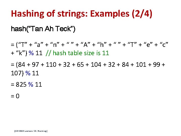 Hashing of strings: Examples (2/4) hash(“Tan Ah Teck”) = (“T” + “a” + “n” + “A” + “h” + “T” + “e” + “c” + “k”) % 11 // hash table size is 11 = (84 + 97 + 110 + 32 + 65 + 104 + 32 + 84 + 101 + 99 + 107) % 11 = 825 % 11 =0 [CS 1020 Lecture 13: Hashing]