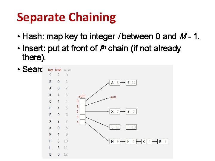 Separate Chaining • Hash: map key to integer i between 0 and M - 1. • Insert: put at front of ith chain (if not already there). • Search: need to search only ith chain.