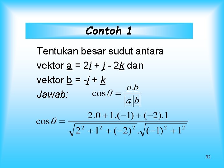Contoh 1 Tentukan besar sudut antara vektor a = 2 i + j - 2 k dan vektor b = -j + k Jawab: 32