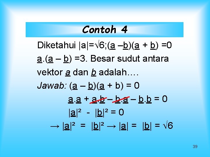 Contoh 4 Diketahui |a|= 6; (a –b)(a + b) =0 a. (a – b) =3. Besar sudut antara vektor a dan b adalah…. Jawab: (a – b)(a + b) = 0 a. a + a. b – b. a – b. b = 0 |a|² - |b|² = 0 → |a|² = |b|² → |a| = |b| = 6 39