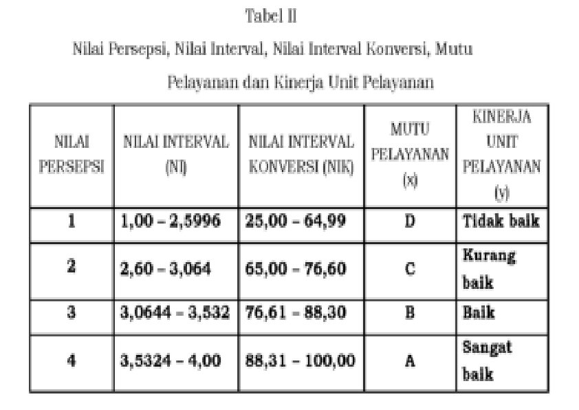 IKM = Total dari Nilai Persepsi per unsur x Nilai Penimbang Total unsur yang terisi Untuk memudahkan interpretasi terhadap penilaian SKM yaitu antara 25 -100 maka hasil penilaian tersebut di atas dikonversikan dengan nilai dasar 25, dengan rumus sebagai berikut : SKM Unit Pelayanan x 25