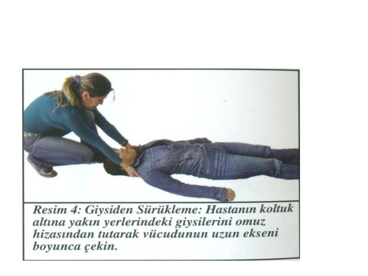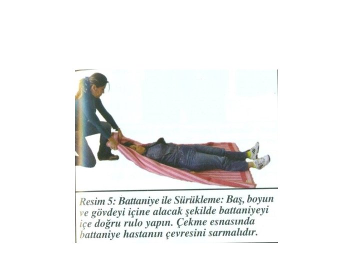 • Sürükleme Yöntemleri Hasta/yaralının sürüklenmesi, oldukça faydalı bir yöntemdir. Özellikle, – çok kilolu ve iri yarı kişilerin taşınması gerekiyorsa; – dar, basık ve geçiş güçlüğü olan bir yerden çıkarmalarda • herhangi bir yaralanmaya neden olmamak için seçilebilecek bir yöntemdir. • İlkyardımcının fiziksel kapasitesi göz önünde bulundurulmalıdır. • Mümkünse battaniye kullanılmalıdır.