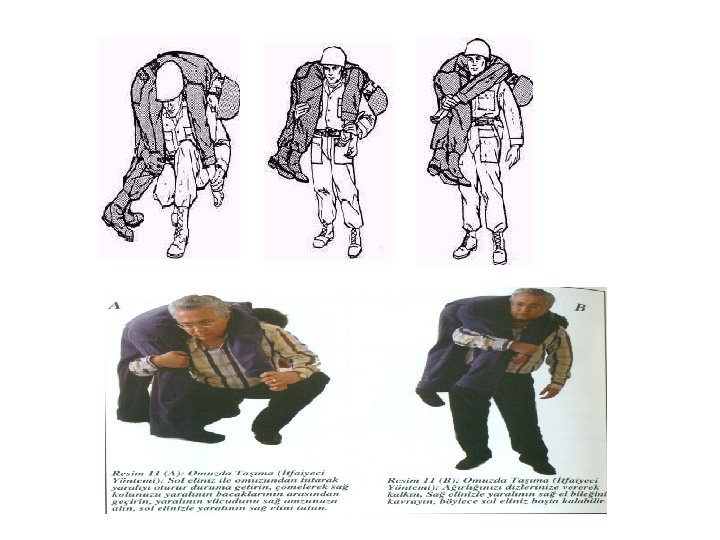 • İlkyardımcı sol kolu ile omuzun dan tutarak hasta/yaralıyı oturur duruma getirir, • Çömelerek sağ kolunu hasta/yaralının bacaklarının arasından geçirir, • Hasta/yaralının vücudunu sağ omzuna alır, • Sol el ile hasta/yaralının sağ elini tutar, ağırlığı dizlerine vererek kalkar, • Hasta/yaralının önde boşta kalan bileği kavranarak hızla olay yerinden uzaklaştırılır