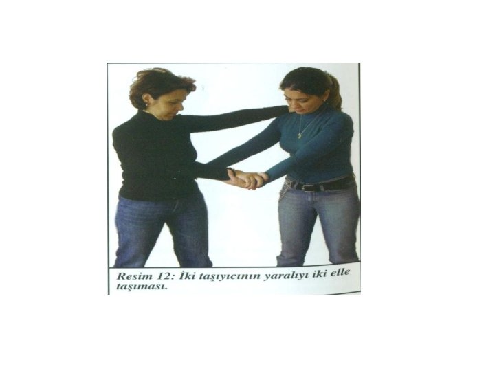 • İki ilkyardımcı ile ellerin üzerinde taşıma (Altın Beşik Yöntemi) : • Hasta/yaralının ciddi bir yaralanması yoksa ve yardım edebiliyorsa iki, üç, dört elle altın beşik yapılarak taşınır. • İki elle: İki ilkyardımcının birer eli boşta kalır, bu elleri birbirlerinin omzuna koyarlar, diğer elleri ile bileklerinden kavrayarak hasta/yaralıyı oturturlar.