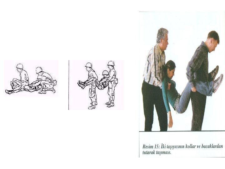 • Sedyenin iki kişi tarafından taşınması: – Her iki ilkyardımcı çömelirler, sırtları düz, bacakları kıvrık olacak şekilde sedyenin iki ucundaki iç kısımlarda dururlar, – Komutla birlikte sedyeyi kaldırırlar ve yine komutla dönüşümlü adımla yürümeye başlarlar, – Önde yürüyen yoldaki olası engelleri haber vermekle sorumludur.