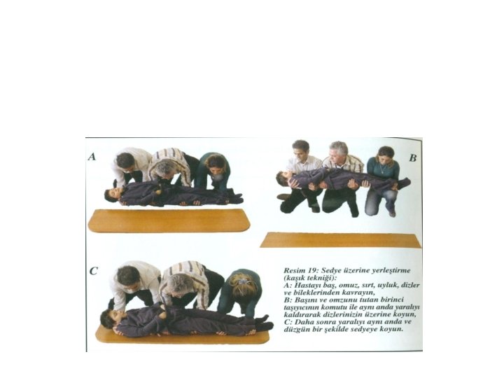 – Baş kısımdaki ilkyardımcılar kollarını baş-boyun eksenini koruyacak şekilde hasta/yaralının sırtına yerleştirirler, – Hasta/yaralının dizleri hizasındaki üçüncü ilkyardımcı kollarını açarak hasta/yaralının bacaklarını düz olacak şekilde kavrar. Verilen komutla, tüm ilkyardımcılar hasta/yaralıyı düz olarak kaldırarak sedyeye yerleştirirler.