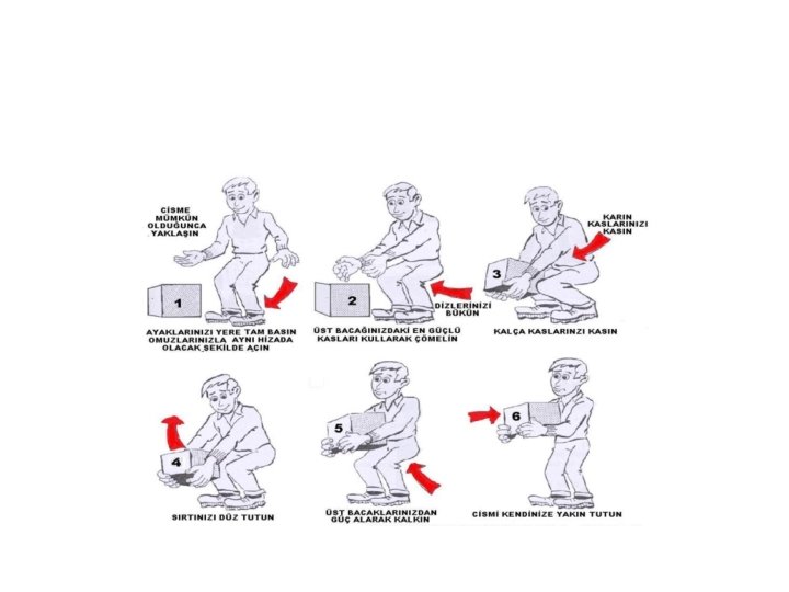 • Ağırlık kaldırırken karın muntazam tutulup kalçayı kasmak gerekir, • Omuzlar, leğen kemiğinin ve omuriliğin hizasında tutulmalıdır, • Yön değiştirirken ani dönme ve bükülmelerden kaçınılmalıdır, • Hasta/yaralı mümkün olduğunca az hareket ettirilmelidir,