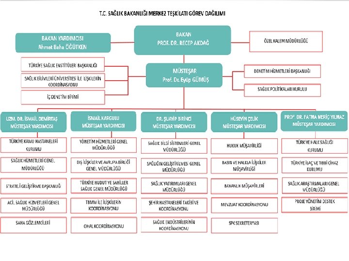 BAKANLIK TAŞRA TEŞKILAT YAPISI BAKANLIK TÜRKİYE HALK SAĞLIĞI KURUMU TÜRKİYE KAMU HAST. KURUMU İl Sağlık Müdürlüğü Kamu Hastaneleri Birliği Genel Sekreterliği İl Halk Sağlığı Müdürlüğü Acil Sağlık Hizmetleri 112 İlçe Sağlık Müdürlükleri Toplum Sağlığı Merkezleri Hastaneler (E 2 -E 3 hariç) Aile Sağlığı Merkezleri ADSM E 2 -E 3 Sınıfı Hastaneler VSD AÇSAP 663 sayılı KHK gereği bağlı kuruluşların taşra teşkilatlarının ilde bağlı oldukları bir kurum/kuruluş yoktur. Ancak 5542 sayılı İl İdaresi Kanunu ve Sağlık Bakanlığı 2013. 3 sayılı Genelgesi gereği sağlık teşkilatının İl Düzeyinde en üst amiri İl Sağlık Müdür.