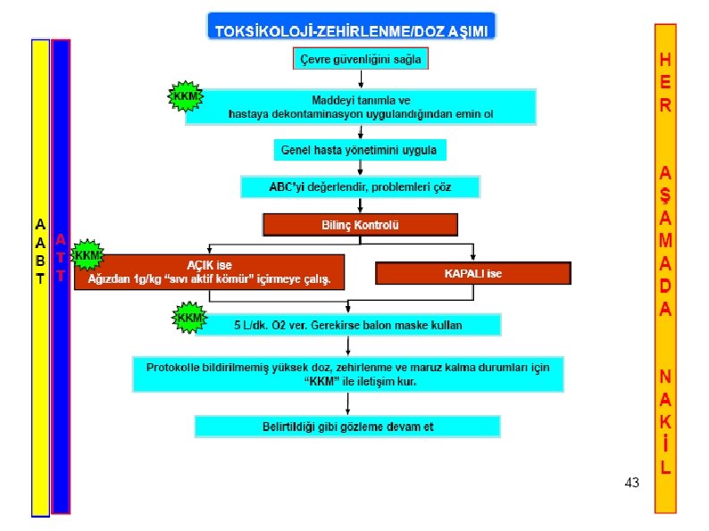 AKTİF KÖMÜR • Kontrendikasyonlar: Ø Solunumu düzensiz, hava yolu kontrol altına alınmamış hastalar Ø İntestinal obstruksiyon Ø Aktif köürün absorbe edemeyeceği (demir, lityum, kurşun, etanol, metanol, siyanür gibi) madde alımı • Uygulama: • Doz: Alınan maddenin muhtemel miktarının 10 katı, 50 g veya 1 g/kg'dır. Ø Ağızdan veya nazogastrik ile uygulanır. Ø En iyi sonuç ilk 1 saat içinde uygulanmasıyla alınır.