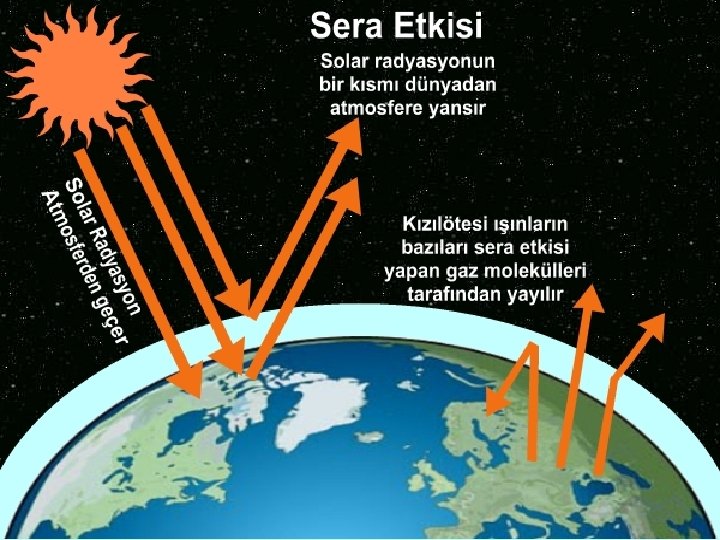 SERA ETKISI Dünya, üzerine düşen güneş ışınlarından çok, dünyadan yansıyan güneş ışınlarıyla ısınır. Bu yansıyan ışınlar başta karbondioksit, metan ve su buharı olmak üzere atmosferde bulunan gazlar tarafından tutulur, böylece dünya ısınır. Işınların bu gazlar tarafından tutulmasına sera etkisi denir. Atmosferde bu gazların miktarının artması Yerküre'de ısınmayı artırır.