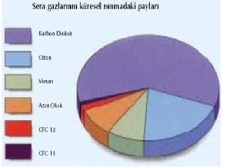 Sera Gazları CO 2 Katkı Oranı (%) %50 Emisyon Kaynakları * Kömür, petrol, doğal gaz gibi fosil yakıtların kullanımı * Ormanların yok edilmesi * Sprey kutularındaki aerosoller CFC %22 * Buzdolaplarındaki soğutucu maddeler * Elektronik sanayiinde kullanılan temizleme maddeleri * Aircondition sistemleri * Pirinç tarlaları CH 4 %14 * Hayvanların mideleri * Biyokütlenin yakılması * Çöp sahaları * Doğal gaz boru hatlarındaki kaçaklar * Maden ocakları O 3 %7 * Trafik * Termik santrallerdeki yanma olayları N 2 O %4 * Tropikal ormanların yok olması * Suni gübreler * Fosil yakıtlar * Naylon üretimi Su buharı %3 . Sera Gazları, Bunların Küresel Isınmaya Katkıları ve Emisyon Kaynakları