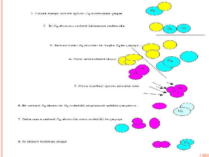 OZON OLUŞUMU, ETKİLERİ a) Ozon (O 3), üç tane oksijen atomunun (O) birleşmesiyle oluşmaktadır. Atmosferde bulunan Azot (N), Oksijen (O 2) ve Karbondioksit (CO 2) gibi temel gazlara göre oldukça düşük oranda bulunan ozon, iklimi etkilemekte ve yeryüzündeki canlıların korunmasında önemli rol oynamaktadır. b) Güneşten gelen yüksek enerjili ultraviole radyasyonunun etkisiyle atmosferde oksijen molekülü (O 2) parçalanarak, serbest oksijen atomu (O) haline dönüşmektedir. Daha sonra bu serbest haldeki oksijen atomları (O) yine ultraviole radyasyonunun etkisiyle oksijen molekülüyle (O 2) birleşerek ozon molekülünü (O 3) oluşturmaktadırlar. Yüksek enerjili ultraviole radyasyonu (UV) ozonun hem oluşumunda, hem de parçalanmasında tek başına etken bir rol oynamaktadır.