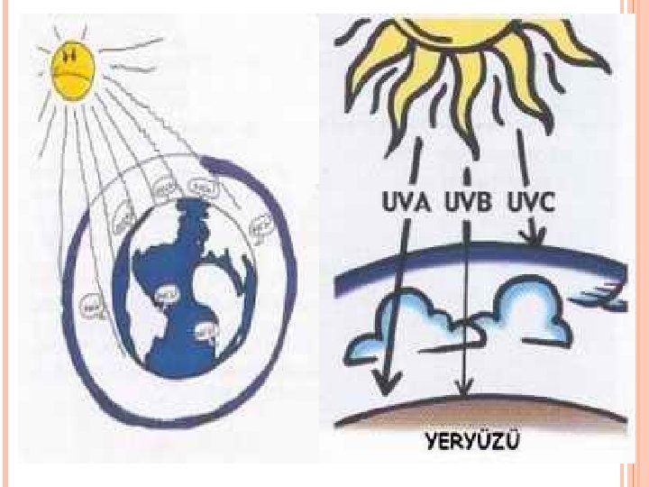 ULTRAVİYOLE(UV) IŞINLARI Güneş radyasyonu veya ışınlarını gönderir. Bu ışınlardan bazıları Ultraviyole ışınları olarak adlandırılır. UV ışınlarını; Aynı karakteristiklere sahip olmadıkları ve canlılar üzerindeki etkilerinin farklı olması sebebiyle UV-A, UV-B ve UV-C olmak üzere üç kategoriye ayırmışlardır. • UV-A: En yaygın ve sağlığımız için en az tehlikeli olan ışınlardır. Ozon tabakası bu ışınların geçmesine izin verir • UV-B: Oldukça tehlikelidir. Bu ışınların büyük bir kısmı, bizlere ulaşmaması için ozon tabakası tarafından engellenir. • UV-C: Sağlık için en tehlikeli ışınlardır. Ozon tabakası bu ışınların bizlere ulaşmasını önler.