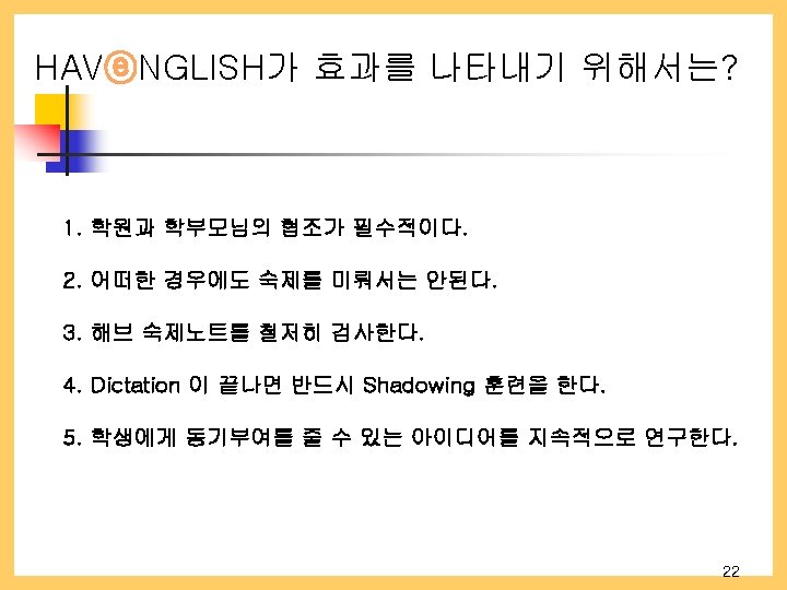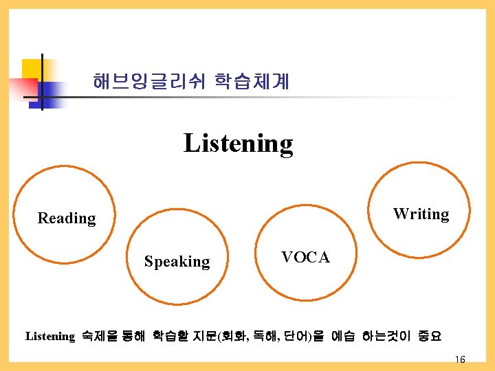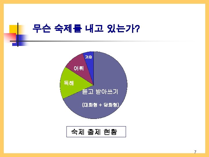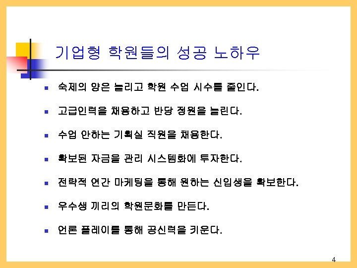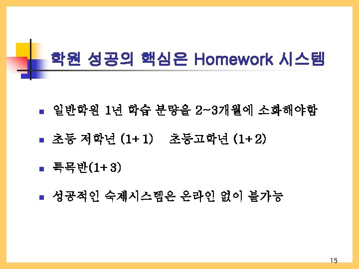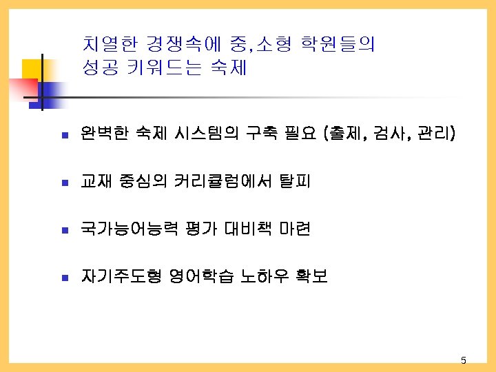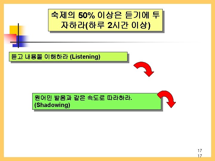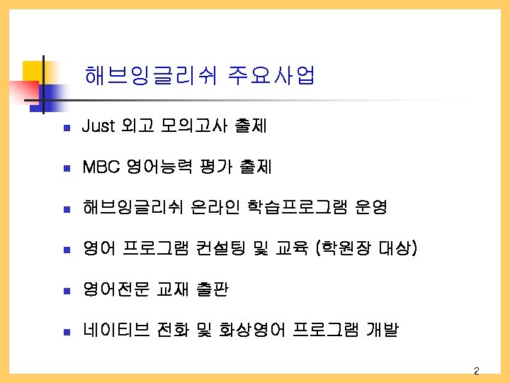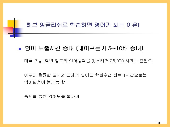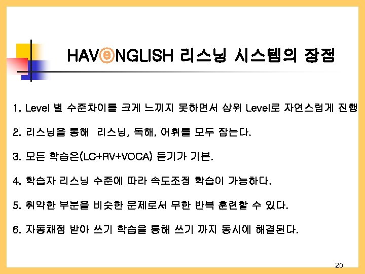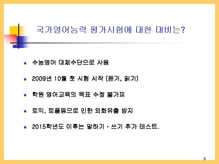 n 학원의 학습목표가 그 학원 수준이 된다. 예제 1> UN 보고서의 내용과 일치하지 않는 것을 고르시오. n ① 70% of the world's population has access to basic facilities. n n n 132 ② More than 1 billion people have no access to clean drinking water. ③ Children suffer more than adults from not having access to clean drinking water. ④ A lack of clean drinking water may be one cause of the spread of disease. ⑤ Problems with nutrition can be caused by lack of clean water. 예제 2> 다음을 듣고 대화가 이루어 지는 장소를 고르시오. 2533 n 1. 식당 2. 편의점 3. 우체국 4. 서점 11