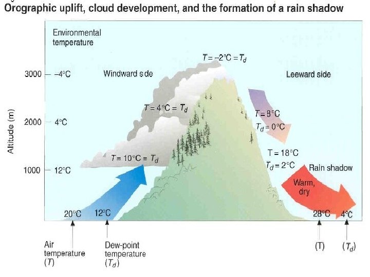 § Orographic Uplift: When air is forced up the side of a mountain or plateau. The air forced up then cools down very quickly and condenses to form rain clouds.