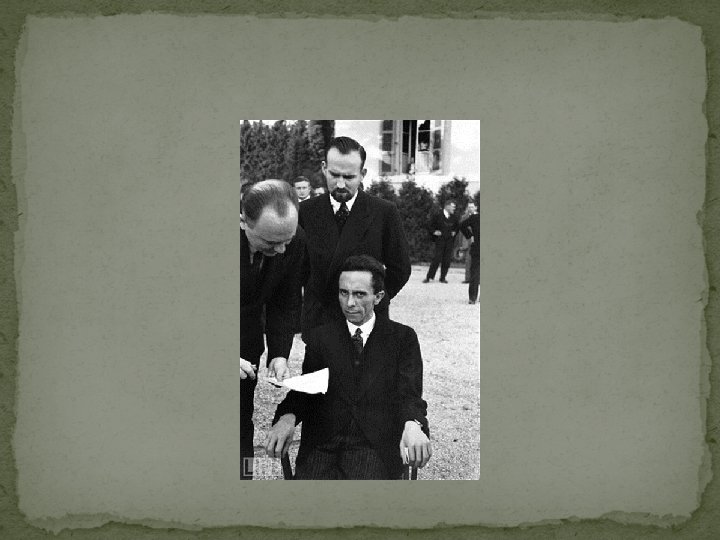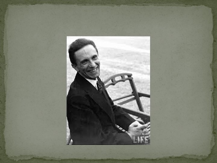 The Mastermind behind the Nazi Propaganda Campaign Joseph Goebbels “The Minister of Propaganda” This photo was taken by Alfred Eisenstaedt , a Jew, at the League of Nations conference in 1933. Like other correspondents, he was there to cover the news — and as a photographer, he was there to take pictures, which is exactly what he did. Like many other German and Austrian Jews, he fled the Nazi threat in the mid-1930 s, and worked as a journalist throughout Europe. This picture was taken while Goebbels was looking at someone beyond Eisenstaedt’s left shoulder.