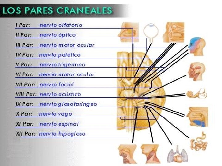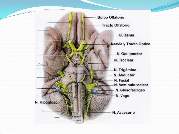 Hay 12 pares de nervios craneales que constituyen los nervios periféricos del encéfalo. Estos nervios abandonan el cráneo a través de fisuras y forámenes para distribuirse en la cabeza y cuello principalmente (a excepción del décimo nervio craneal que inerva estructuras torácicas y abdominales). Los nervios craneales son: üNervio Olfatorio (par craneal I) üNervio Óptico (par craneal II) üNervio Oculomotor (par craneal III) üNervio Troclear (par craneal IV) üNervio Trigémino (par craneal V)