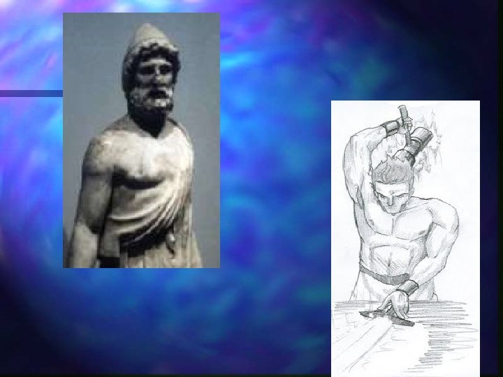 HEFESTO DIOS DEL FUEGO Y DE LA FORJA, ARTESANO n n El Dios del fuego y de la metalurgia-herrero, protector de las artes, del trabajo, del metal y artesano por excelencia. Aparece siempre representado como un hombre tremendamente fornido, sudoroso, con una pierna débil y trabajando en una fragua. Hijo de Zeus y de Hera. Vulcano para los romanos.