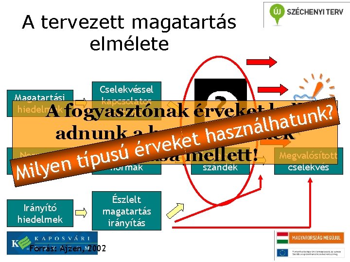 A tervezett magatartás elmélete Magatartási hiedelmek Cselekvéssel kapcsolatos attitűdök A fogyasztónak érveket kellunk? t a h l á n z adnunk a hazai termékek s a h t e k e v r é Normatív Szubjektív Cselekvési Megvalósított ú vásárlása mellett! s u típ normák hiedelmek szándék cselekvés n e y l i M hiedelmek normák Irányító hiedelmek Észlelt magatartás irányítás Forrás: Ajzen, 2002 szándék cselekvés