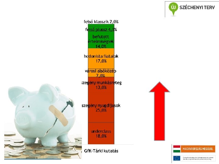 Lecsúszáskerülő stratégiák • Először csökkentik a háztartások a láthatatlan fogyasztáshoz tartozó vásárlásaikat, vagy olcsó terméket választanak az eddigi márkásak helyett • Második lépés a látható fogyasztás területén való visszalépés, ekkor már „látszik” a probléma, érzékelhető az adott ember megjelenésében, sőt előbb-utóbb a tartásán is a probléma • Harmadik lépés, ami a leginkább drasztikus, az a környezet megváltoztatása, új vonatkozási csoport választása Forrás: Törőcsik, 2011