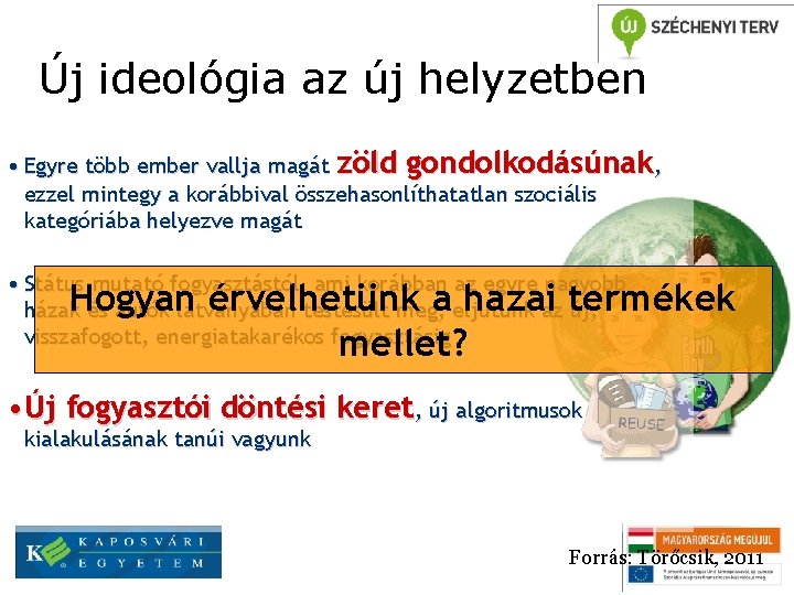 Új ideológia az új helyzetben • Egyre több ember vallja magát zöld gondolkodásúnak, ezzel mintegy a korábbival összehasonlíthatatlan szociális kategóriába helyezve magát • Státus-mutató fogyasztástól, ami korábban az egyre nagyobb házak és autók látványában testesült meg, eljutunk az új, visszafogott, energiatakarékos fogyasztásig Hogyan érvelhetünk a hazai termékek mellet? • Új fogyasztói döntési keret, új algoritmusok kialakulásának tanúi vagyunk Forrás: Törőcsik, 2011