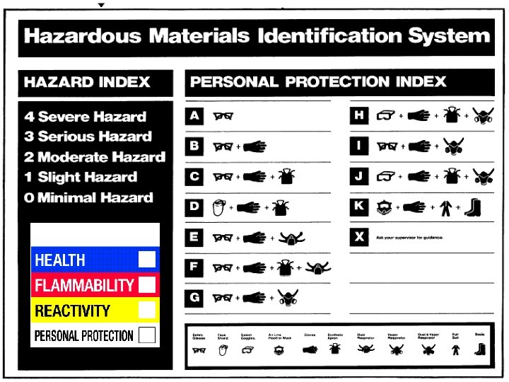 Uniform Labeling System… l “Uniform Labels” are used to ensure we have one labeling system. l 2 Basic “Uniform Labels” » HMIS - Hazardous Material Identification » NFPA - National Fire protection Association – Both types must identify the – chemical name and hazards