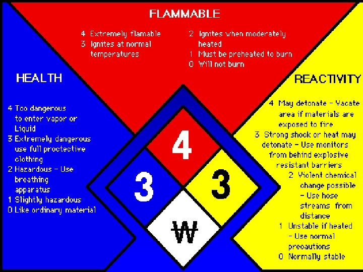 Each MSDS tells you… 5. Fire and explosion hazard data 6. Reactivity data 7. Health Hazard data 8. Precautions for safe handling 9. Control measures