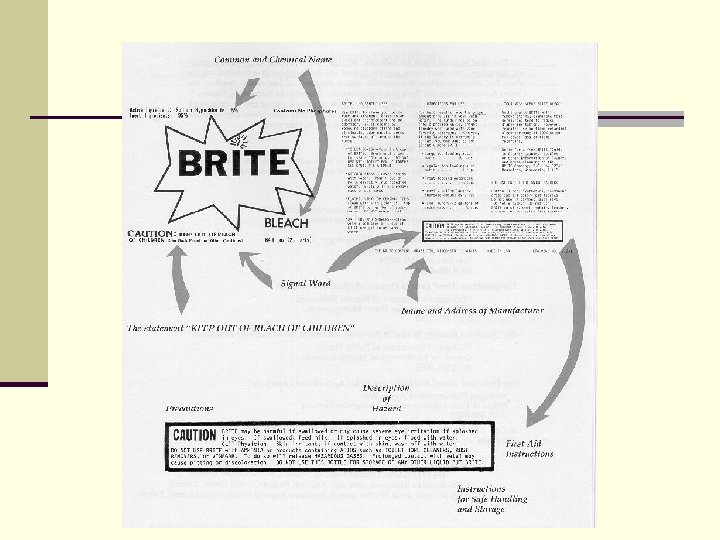 Labels and Warning Signs n Identity- can be chemical or common name as long as it is the same term on the label, chemical list and MSDS. n Hazard Warning- convey physical or health effects of a chemical; e. g. “potential carcinogen” or “causes lung damage or “flammable”. If available, must convey target organ effect.