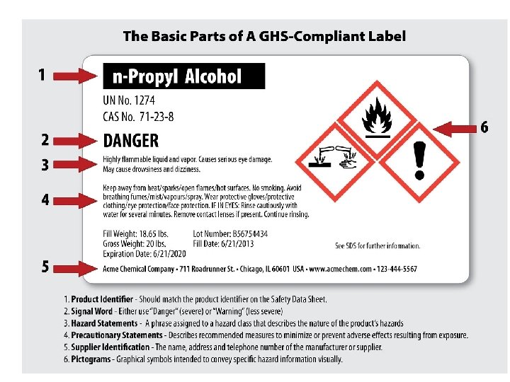 OSHA Standard HCS specifies that information on chemical hazards be provided through the following: ü ü ü access to safety data sheets (SDS) properly labeled chemical containers appropriate training on chemical hazards and safe work procedures