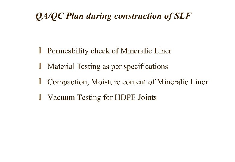 CPCB CRITERIA FOR NON- ACCEPTANCE OF WASTE IN SLF q Bulk or non-containerized liquid hazardous waste q. Slurry type hazardous waste containing free liquid or waste sludge q. Incinerable / compostable waste or any other type of waste from which energy recovery is feasible q. In-compatible wastes not to be placed in same landfills