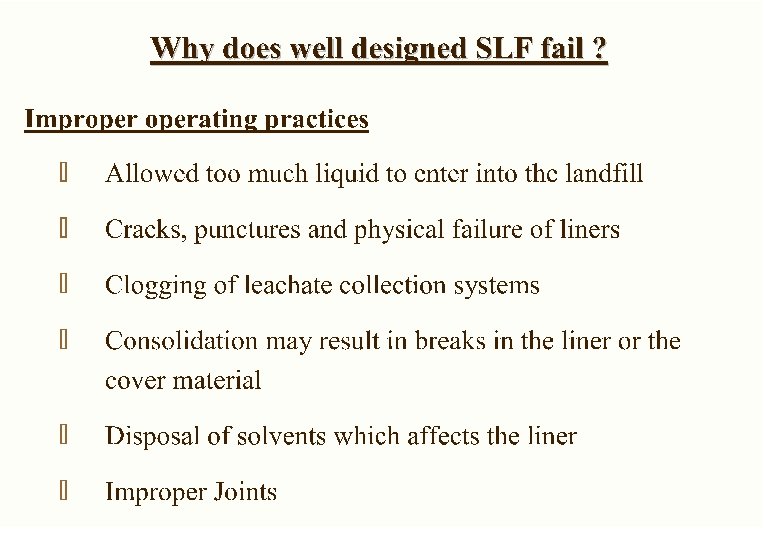CPCB CRITERIA FOR NON-ACCEPTANCE OF WASTE IN SLF q. Wastes in-compatible with liner material without containerisation q. Extreme hazardous waste (e. g radioactive waste) q Non-hazardous waste (e. g MSW) not to deposited in HW Landfills