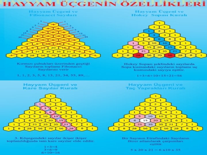Ömer Hayyam üçgeni kenarlarda "1" olmak üzere her sayı, üstündeki iki sayının toplamı olarak yazılacak şekilde oluşturulur. Ömer Hayyam üçgeninin bazı özellikleri: • Kenarlar 1 den oluşur • ikinci(kırmızı) sıra, pozitif tamsayılar serisidir. • Üçüncü(mavi) sıra, üçgen sayılardır. (1, 3, 6, 10 15, . . . ) • Aynı yöndeki sayıların(sarı) toplamı, seçtiğimiz son sayının ters yönündeki sayıya eşittir. (Örnek: 1+2+3+4+5+6+7=28, 1+4+10+20+35=70 gibi) • Her sıradaki sayıların toplamı, ‘sıfır’ dan başlamak üzere "2"nin üslerini verir. 20, 21, 22, 23 , 24 , . . . (Örnek: 5. sıradaki sayıların toplamı, 1+4+6+4+1=16=24 ) • Her sıra, yine 'sıfır‘ dan başlamak üzere kendi derecesinden bir polinomun katsayılarını verir. ( Örnek: (a+b). 3=1 a 3+3 ab 2+3 a 2 b+1 b 3)