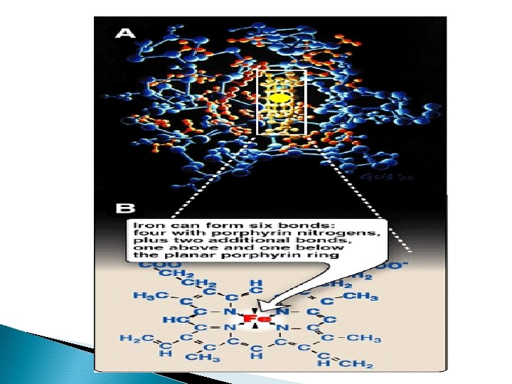 Structure of heme Heme is a complex of protoporphyrin IX and ferrous iron (Fe 2+). The iron is held in the center of the heme molecule by bonds to the four nitrogens of the porphyrin ring. The heme Fe 2+ can form two additional bonds, one on each side of the planar porphyrin ring. In myoglobin and hemoglobin, one of these positions is coordinated to the side chain of a histidine residue of the globin molecule, whereas the other position is available to bind oxygen
